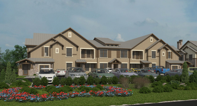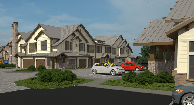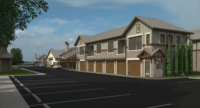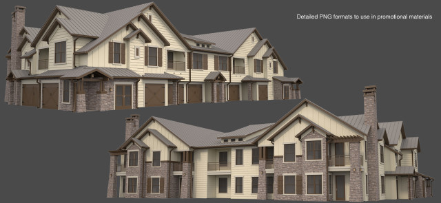 Because of the complexity of each of 5 building types involved, each model was created individually and all were merged into one final aerial. Image views were selected from the completed model. Revisions included paint colors, stone materials, and balcony railings.