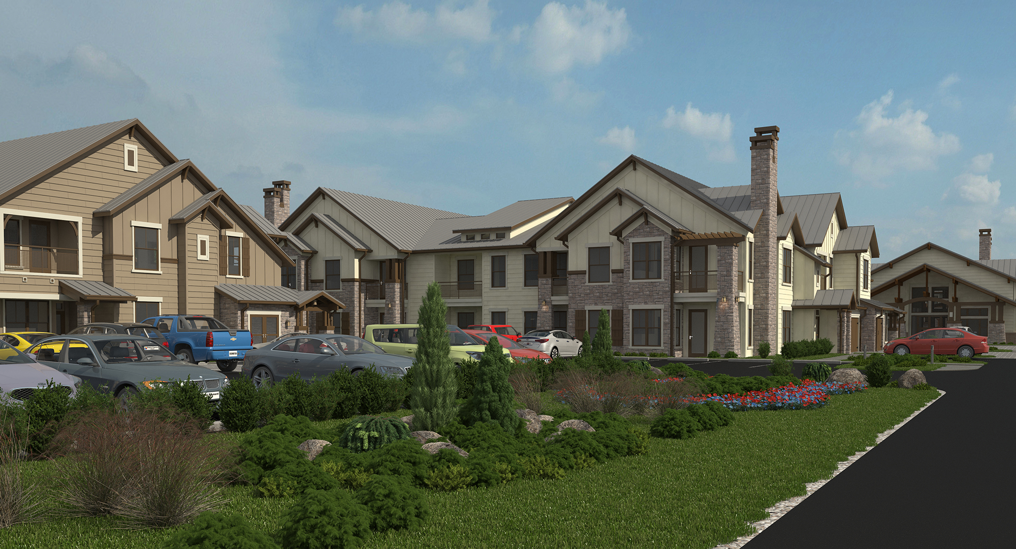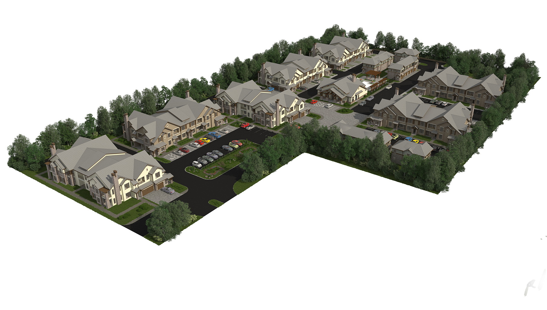 Because of the complexity of each of 5 building types involved, each model was created individually and all were merged into one final aerial. Image views were selected from the completed model. Revisions included paint colors, stone materials, and balcony railings.
